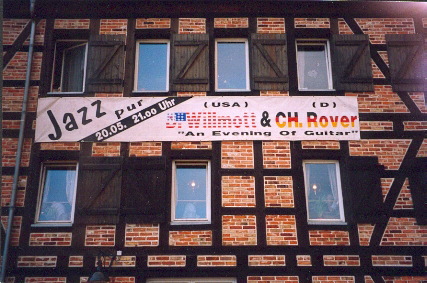 Berklee Professor, teacher of Bill Frisell and others a friend and a great guy. He also leads a guitar orchestra featuring some of the finest American and European guitarists appropriately called "Bret's Frets". During a European tour Bret and Christian took off from the Frets for some duo club dates in Germany. The banner above (notice their individual names depicted as flags) attached to a converted storage house / concert hall in Stralsund on the East German seaside has to be one of the most passionate advertisements ever seen for a jazzguitar duo gig. |